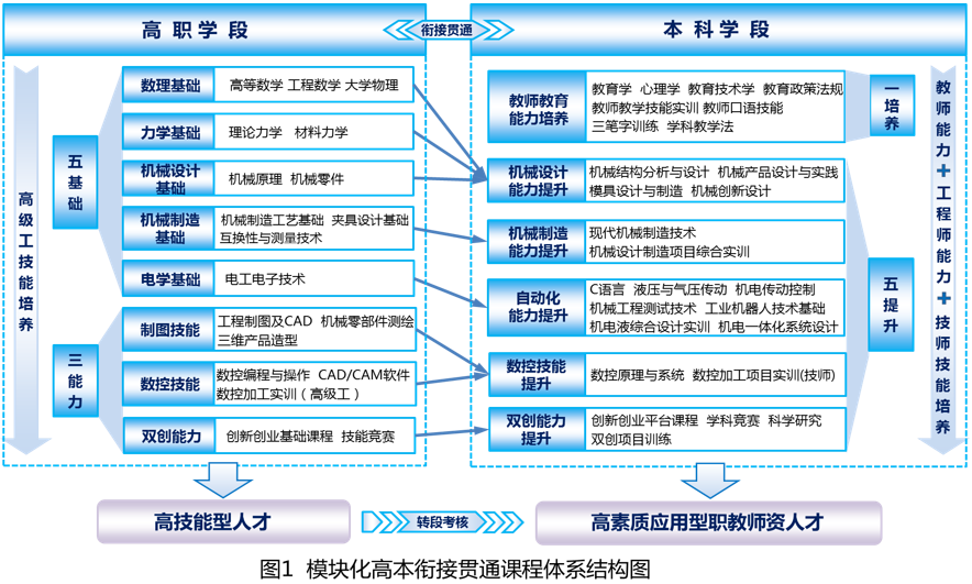 深入本科、高职、中职和企业开展职教师资供需调研,通过明确高职与本科的培养目标和规格,建构职教师资职业能力体系,确定课程与能力的衔接关系,创新研制了《高本衔接专业教学标准》,形成了高本衔接人才培养规范。重点基于职教师资职业能力成长规律,以“三师能力”为核心、“能力分级”为导向、“系统培养”为主线,建构了高职学段的五基础(数理、力学、机械设计、制造、电学)、三能力模块(制图、数控(高级工)、双创),与本科学段的一培养(教师教育能力)、五提升模块(机械设计、制造、自动化、双创、数控(技师)能力)贯通的课程体系,通过高职与本科知识能力的有效衔接,实现了“工程师+技师+教师”“三师”能力的分级系统培养。有效解决了高本衔接培养职教师资“无标准可循”的问题。