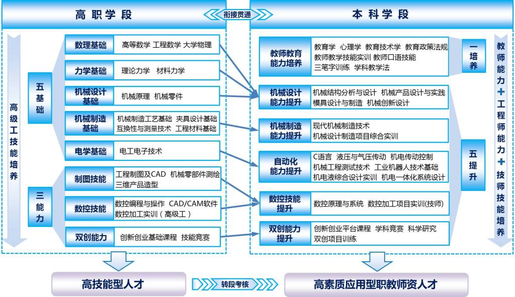 创建了“五基础、三能力、一培养、五提升”的模块化高职本科衔接贯通课程体系(如下图所示),实现了高职学段的五基础(数理、力学、机械设计、制造、电学)、三能力模块(制图、数控(高级工)、双创),与本科学段的一培养(教师教育能力)、五提升模块(机械设计、制造、自动化、双创、数控(技师)能力)的衔接贯通,促进了高职与本科的知识能力体系的有效衔接,实现了“工程师+技师+教师”“三师”能力的分级系统培养。
